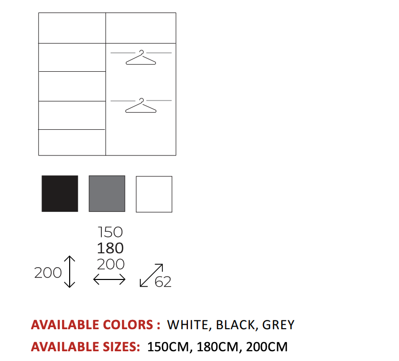 Available in versatile shades of White, Black, and Grey, the Infinity wardrobe adapts easily to different interiors — from minimalist bedrooms to chic apartments. With sizes ranging from 150cm to 200cm, it offers flexible options to fit both compact and larger spaces.